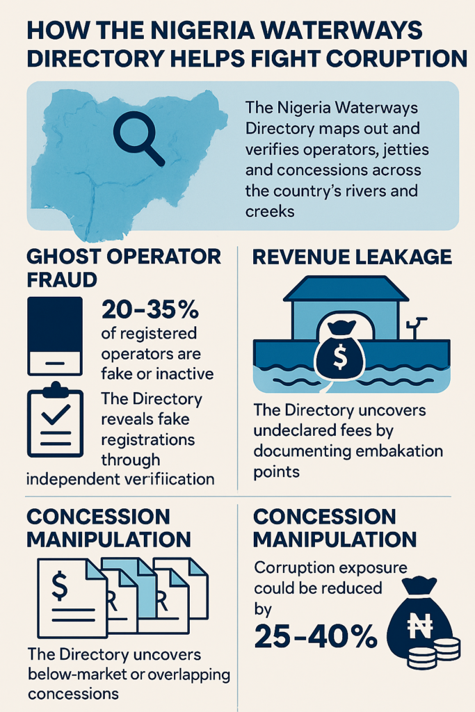 Industry analysts estimate that a significant proportion — conservatively put at between 20 and 35 percent — of registered waterway operators in Nigeria exist only on paper, created to siphon licensing fees, government contracts, or subsidy allocations. The Directory, by physically verifying and cataloguing operational entities against geographic coordinates, vessel descriptions, and owner identities, creates an independent verification layer. When ICPC investigators cross-reference NIWA’s licensing database against the Directory, discrepancies pointing to ghost registrations become far harder to conceal.