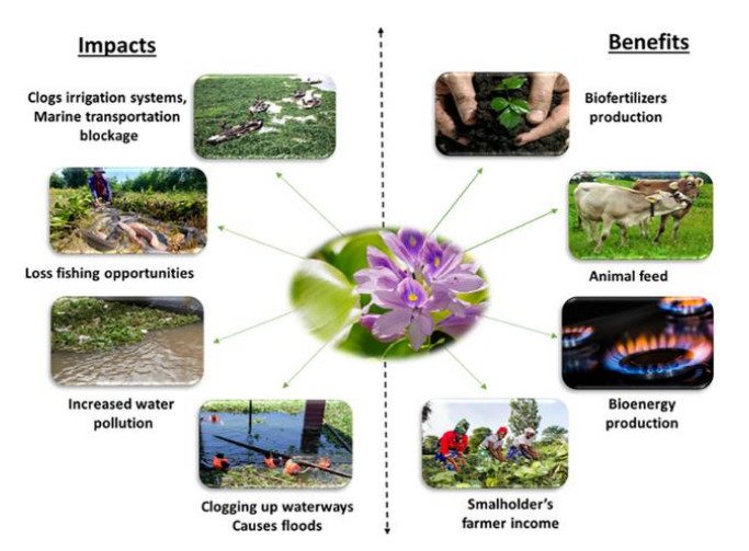 Water Hyacinth has caused major disruptions to a number of ecosystems and also to human communities. Environmental problems associated with the water hyacinth are most prominent in warm areas where the weed grows throughout the year and develops into dense large, free-floating, monospecific islands or mats which compete with other aquatic species for light, nutrients and oxygen.